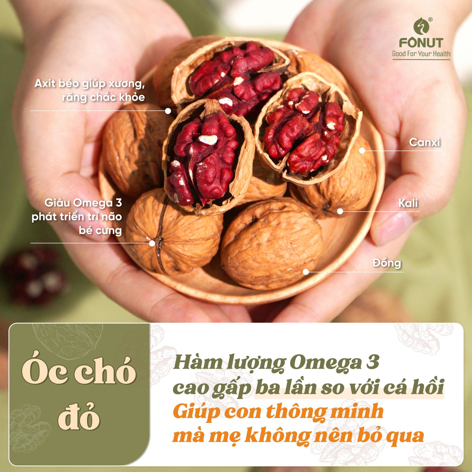 Hạt óc chó đỏ còn vỏ là “siêu thực phẩm” giàu dinh dưỡng, nổi bật với lượng Omega-3 cao cùng nhiều vitamin, khoáng chất thiết yếu. Đây là lựa chọn lý tưởng cho mẹ bầu muốn bổ sung dưỡng chất giúp thai nhi phát triển trí não và hệ thần kinh ngay từ trong bụng mẹ. Ngoài ra, loại hạt này cũng rất phù hợp với người ăn chay, người già và người đang ăn kiêng, giảm cân.