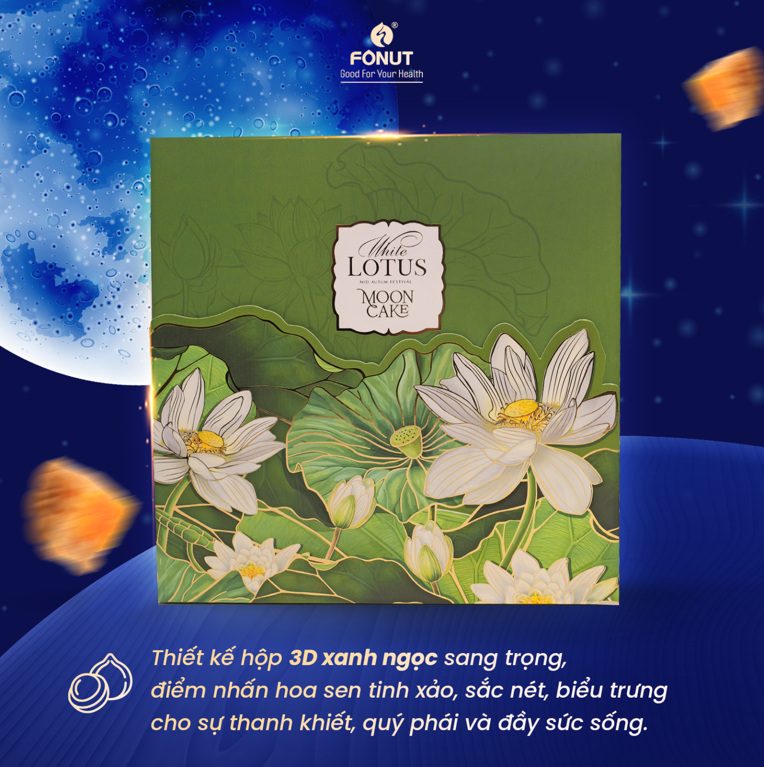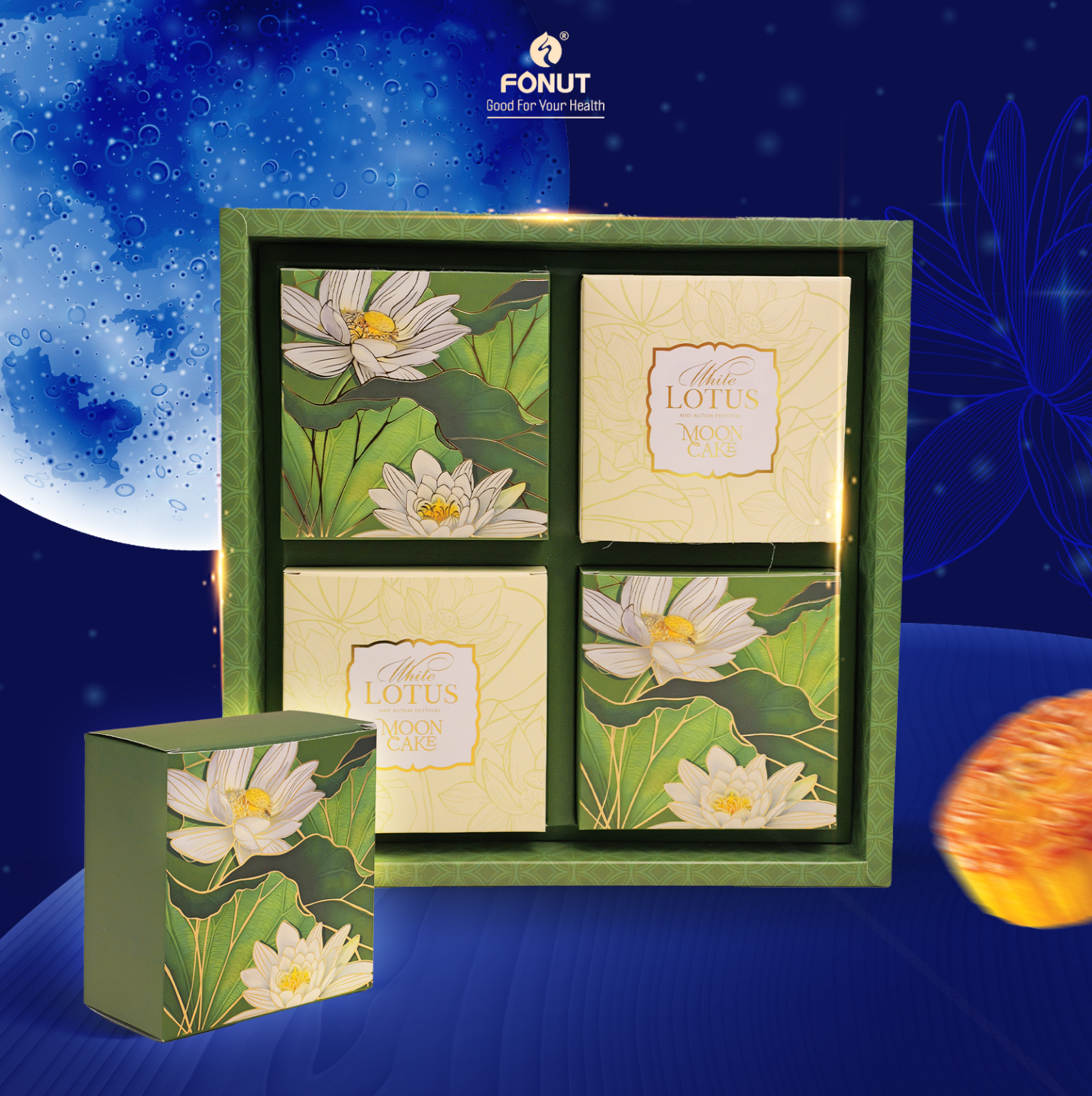 Hộp quà trung thu Sen Ngọc Đoàn Viên thuộc bộ sưu tập Trung Thu 2025 của FONUT, gồm 4 bánh trung thu cao cấp – mỗi chiếc bánh là sự kết hợp tinh tế giữa hương vị truyền thống và thành phần dinh dưỡng hiện đại.