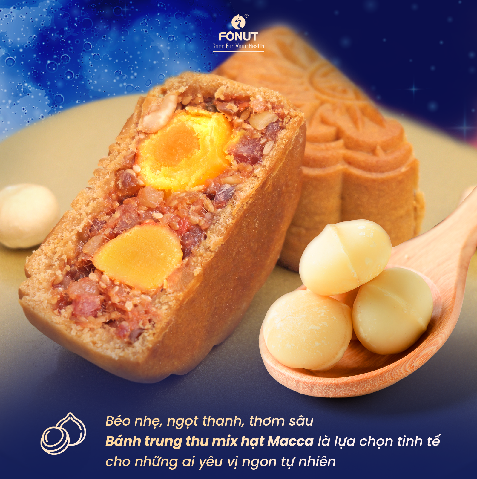 Khác biệt hoàn toàn với các sản phẩm trên thị trường, FONUT chọn hạt Macca nhập khẩu từ Úc để làm điểm nhấn cho mọi loại bánh, vừa ngon miệng, vừa bổ dưỡng.